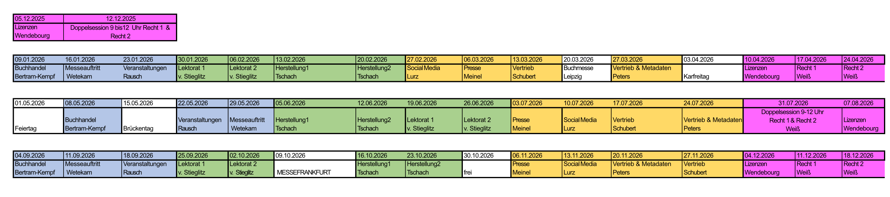 Dieses Seminar bietet Volontär*innen, Quereinsteiger*innen, nach Orientierung suchenden Studierenden, sowie Verlags-Neugründer*innen einen Einblick in die verschiedenen Bereiche und Arbeitsprozesse des Buchverlags. Ursprünglich konzipiert, um Volontär*innen in Buchverlagen einen Querschnitt auch über die Themen zu vermitteln, die nicht unmittelbar mit dem eigenen Volontariat in Zusammenhang stehen, hat die Seminarreihe durch spannende, praxisnahe Inhalte und Expert*innen und Referent*innen viele mehr erreicht und überzeugt – von Autor*innen, Freelance-Lektor*innen und jungen Verlagsmenschen über Controller*innen bis zu frischen Universitäts-Absolvent*innen.