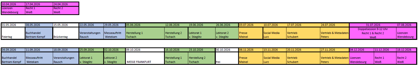 Die Module finden jeweils wöchentlich freitags (mit Ausnahme, z.B. während der Buchmessen) und im rotierenden, wiederkehrenden Modus statt, mit der Möglichkeit für die Teilnehmer*innen auch später – mit Beginn eines neuen Blocks (siehe unten) – neu in die Seminarreihe einzusteigen. Zudem wird es möglich sein, die Aufzeichnung einer verpassten Session im Nachgang via Stream* anzuschauen (*Stream bis zu zwei Wochen lang verfügbar). Durch die verschiedenen Einstiegs- und Nachbereitungsmöglichkeiten können alle Teilnehmenden die 14 Module flexibel durchlaufen – egal, wann ihr Volontariat beginnt oder wie es zeitlich passt. Gebucht werden kann immer nur das Gesamtpaket und keine individuellen Module.